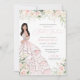 Elegante design de luxo com rosas brancas e rosas cor-de-rosa com pincel suave, sotaques de rosa, e uma bela boneca com um luxuoso vestido de bola voada. Todo texto é totalmente personalizável.