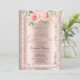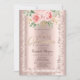 Coroa de brilho elegante, rosas e moldura em convite de festa quinceañera dourado rosa.