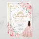 O convite para celebração da Quinceanera, cor-de-rosa, ouro e branco. Possui uma morena em vestidos de capa de bola, fonte de script, borboletas douradas, rosas rosa e tiara. Perfeito para uma elegante celebração de glam estilo princesa. Personalize com seus próprios detalhes. Impressos convites Zazzle ou modelo de impressão digital instantânea para download.