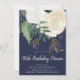 Um sofisticado convite para o janto de 50 anos em brilho de marinho, verde, branco e dourado falso, com rosas e folhas de aquarelas e com letra de estilo manuscrita.