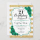 Convite de festas aniversário de 21 anos. Elegante design verde esmeralda floral com rosas. Apresenta fontes de dourado brilhante e listras brancas e de script. Perfeito para uma comemoração de dia das mulheres na moda. Pode ser personalizado para qualquer idade! Impressos convites Zazzle ou modelo de impressão digital instantânea para download.