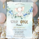 Este primeiro convite de aniversário com elefante azul de cor-d-água e rosas e folhas azuis.