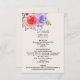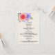 Cartão de cerimônia com detalhes de casamento com um buquê floral fantástico com rosas de aquarelas. Na moda, capricho e criativo. Um conjunto de rosas em rosa, roxo e amarelo. Com muitos galhos e folhas em verde, rosa, roxo e azul. O fundo é uma cor de champanhe esbranquiçada.