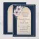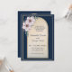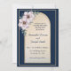 Convite de casamento azul marinho elegante moderno com rosas e moldura dourada.