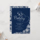 Simples elegante 50º convite de aniversário em marinho e prata. Design clássico com rosas, folha prateada falsa e letra de script de tipografia. A Trendy convida o cartão perfeito para uma festa de na moda. Personalize com seus próprios detalhes. Pode ser personalizado para qualquer idade. Impressos convites Zazzle ou modelo de impressão digital instantânea para download.
