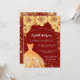 Um convite moderno, na moda e glamouroso para uma Quinceañera, festa de aniversário 15. Um fundo vermelho com poeira falsa dourada, um vestido e ouros, flores. O nome é escrito com um moderno estilo escrito à mão. Personalize e adicione os detalhes da sua festa.