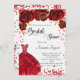Um convite moderno, na moda e glamouroso para um Chá de panela. Um fundo branco com brilhos, um vestido vermelho e rosas vermelhas, flores. O nome é escrito com um moderno estilo escrito à mão. Personalize e adicione os detalhes da sua festa.