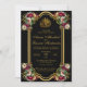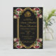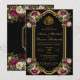 Este elegante design floral apresenta um quadro de ouro rodeado por rosas bege e burgundy. Ele também apresenta fundo preto e fonte de cor do ouro, que podem ser alteradas em cor se você desejar. O verso também exibe o quadro do ouro, os rosas e os nomes do noivo e do noivo.