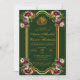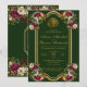 Este elegante design floral apresenta um quadro de ouro rodeado por rosas bege e burgundy. Ele também apresenta fundo verde escuro e fonte de cor do ouro, ambas podendo ser alteradas em cor se você desejar. O verso também exibe o quadro do ouro, os rosas e os nomes do noivo e do noivo.
