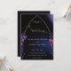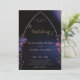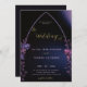 Rosas e folhas de eucalipto, desenhadas à mão em lápis colorido e revestidas digitalmente com roxo, fazem um convite de casamento moderno, sofisticado, elegante, mas chic, que tem um quadro simples e minimalista de arco gótico. O fundo azul preto e escuro com pistas de roxo e luzes iluminam o céu da meia-noite. A elegante caligrafia, na matiz do ouro, torna esse convite na moda preto e roxo ainda mais elegante.