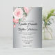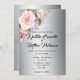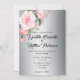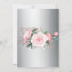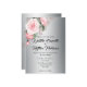 Um belo convite de casamento cor-de-rosa floral e prata, com um buquê de lindas rosas cor-de-rosa no canto superior esquerdo, numa base prateada metálica. Todos os detalhes podem ser facilmente personalizados para se adequar, clicando no link Personalizar este modelo acima. O inverso do convite tem o mesmo fundo prateado, com o buquê rosa-rosa no meio.