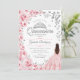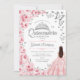 Convite para celebração da Quinceanera floral, rosa-claro, branco e prateado. Possui uma garota morena em vestidos de vestido de bola, fonte de script, borboletas prateadas, rosas rosa pinceladas e tiara. Perfeito para uma elegante celebração de glam estilo princesa. Personalize com seus próprios detalhes. Impressos convites Zazzle ou modelo de impressão digital instantânea para download.