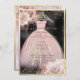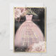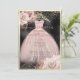 Este convite personalizado encantador apresenta um tema de quinceñera cor-de-rosa-claro e dourado. Um vestido de vestido de bola glamouroso é colocado no centro, sobre um fundo preto. Uma película dourada tiara repousa sobre o vestido, com uma armação dourada correspondente. Buquês de rosas embaçados destacam os cantos, e a brilha cor-de-rosa é borrifada nas partes superior e inferior.