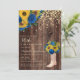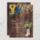 convite de festas aniversário de 30 anos com botas de cowboy rústicas, girassóis amarelos brilhantes e belos rosas azuis sobre um fundo castanho escuro.