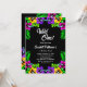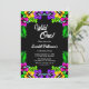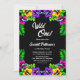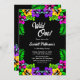 Este elegante convite de aniversário tropical é perfeito para um aniversário de verão moderno. O simples design apresenta flores amarelas, roxas e magenta floridas com tipografia branca elegante sobre fundo preto em negrito.