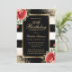Convite floral de 50 anos, branco e preto elegante, com striptease esbranquiçada, contendo uma moldura de ouro decorada por confete de ouro, rosas vermelhas e verde.