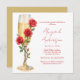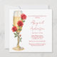Convite de chá de noiva com rosas vermelhas no chuveiro de champanhe. Nome em roteiro moderno vermelho. Texto vermelho. Imagem de aquarela. Chá de noiva vermelho. Chuva de rosas vermelhas.