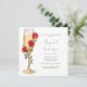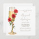 Convite de chá de noiva Red Roses on Champagne Shower. Nome em roteiro moderno vermelho. Texto dourado. Imagem de aquarela. Chá de noiva vermelho. Chá de noiva de rosas vermelhas. Fundo branco.