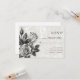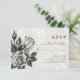 Este cartão de RSVP de casamento elegante apresenta um fundo branco acinzentado com um efeito de textura marginal, e uma ilustração vitoriana de rosas vintage pretas e brancas que foram transformadas em um visual muito moderno.
