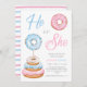 Um doce rosquinha chamado Gênero do Bebê Revela convite de festas. O texto da tipografia azul e rosa diz "Ele ou ela", num fundo branco com donuts de aquarela.