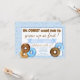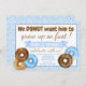 Convites de festas de aniversários de rosquinha de menino com rosquinhas de fosco castanho e azul em um fundo azul com várias cores. Este convite de aniversário de rosquinha é facilmente personalizado para o seu evento simplesmente adicionando os seus detalhes.