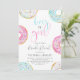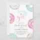 Menino ou menina? Convide familiares e amigos para o seu gênero revelarem a festa com este convite para chás de fraldas rosquinhas coloridas e festivos. Ele apresenta ilustrações de aquarela de rosquinhas cor-de-rosa, rosquinhas azuis e rosquinhas brancas com aspersores. Personalize adicionando nomes e outros detalhes do evento. Este gênero de tema rosquinha revela que o convite é perfeito para qualquer tema ou estação de chá de fraldas.