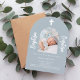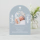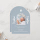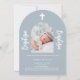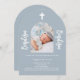 Fundo azul empoeirado, decorado com uma cruz branca Personalize e adicione um nome e detalhes da foto. Texto branco. Quadro fotográfico em forma de arco.