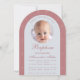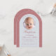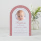 Um convite batismo moderno para o batizado de uma menina. Em um fundo poeirento de rosa com um padrão de cruzes de rosa, poeirentas, pequenas e mais leves, ele tem um arco branco com uma foto redonda com espaço reservado e dentro de texto cor-de-rosa rosa poeirento. A palavra batismo e o nome são escritos num roteiro caligráfico elegante; a primeira linha, acima da foto, é o texto arquivado. A foto marcadora de uma menina é de Amy Elizabeth Quinn, da Pixabay, e é grátis para uso comercial.