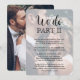 Convide familiares e amigos para testemunharem você dizer "sim" novamente com um elegante convite de casamento moderno com sobreposição de texto e 2 fotos para uma sequência. Todas as palavras são simples de personalizar, incluindo a citação que diz "nós fazemos parte II". Personalize-o para qualquer tipo de celebração de casamento, como uma cerimônia de renovação de votos, recepção de 1º aniversário, festa pós-fuga, hora do coquetel ou jantar. Personalize com os detalhes de sua escolha, incluindo data do casamento, RSVP, código de vestimenta, site, etc. (DICA DE COLOCAÇÃO DE IMAGEM: Uma maneira fácil de centralizar uma foto exatamente como você deseja é cortá-la antes de fazer o upload para o site da Zazzle.) O design moderno minimalista preto e branco apresenta duas fotos do casal recém-casado, caligrafia de roteiro manuscrita moderna e tipografia elegante no estilo de máquina de escrever. Quer você tenha fugido devido à pandemia de covid ou tenha reduzido para uma minimoniança ou micro-casamento menor e mais ínt
