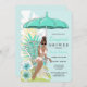 Convite de chuveiro de lingerie bridal apresenta flor tropical azul de ovo de robin e azul turquesa, guarda-chuva e noiva afro-americana a ser. Disponível com cabelo loiro, castanho e ruivo e pele clara e escura.