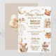 Este convite de chá de bebê adorável apresenta um ursinho marrom neutro sentado em uma cesta segurando um balão. Ao redor das bordas estão um carrinho de bebê antigo, presentes, blocos de ABC, um chapéu, sapatinhos preciosos, um conjunto e a lua e as estrelas. Personalize o convite com os modelos fáceis de usar fornecidos. O verso tem um padrão de treliça com um grande balão e buquê floral no centro