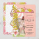 Convite de chuveiro de lingerie tropical apresenta brilho, flores cor-de-rosa e coral, guarda-chuva e noiva com cabelo loiro, castanho ou ruivo. Também disponível com tom de pele escura.