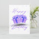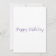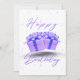 Este convite tem as palavras "Feliz Aniversário" em uma fonte de impressão única, mostrando letras coloridas em roxo claro, além de dois presentes embrulhados com laços roxos e confetes correspondentes ao longo do fundo neste tema e estilo de aniversário. Impresso em um papel clássico, de todos os lados, com 17,5 pt de espessura e acabamento fosco não revestido com textura de casca de ovo, feito e impresso nos EUA, com "Feliz Aniversário" impresso no verso.