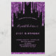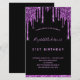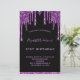 Um convite de aniversário feminino e feminino de 21 ruas (ou qualquer idade). Na frente: Um fundo preto chic. Decorado com púrpura escura e púrpura pingando, pintura pingando aparência. Personalize e adicione um nome e detalhes da parte. O nome é escrito com um script de estilo manuscrito, letras claras e roxas.
