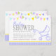 Convite para chá de fraldas giro, com um simples carrinho / charlatão / design de pram com sinalizadores de bunting. Bonito convite para chás de fraldas roxos neutros. Personalize com seus detalhes de chá de fraldas. Ilustrada e desenhada exclusivamente por Sarah Trett.