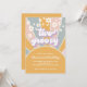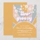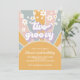 convite de primeiro aniversário inspirado no sol Groovy retrô com margaridas e fontes e cores estilo anos 70.
