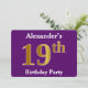 Este design de convite apresenta o número normal "19º" com uma aparência falsa em forma de ouro. Ele também apresenta um nome personalizado e um fundo de cor roxa. Os detalhes do evento no verso podem ser personalizados. Poderia ser usado para convidar pessoas para a décima nona festa de aniversário de alguém. [~Z0000014]