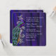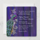 Cetim roxo rico elegante que olha o convite quadrado do casamento, com gráficos bonitos de um flourish de prata do tom acima do lado esquerdo com um pavão colorido, no meio da decoração do flourish. O texto no branco está pronto para personalizar para seu dia do casamento. Produtos de harmonização disponíveis.