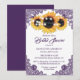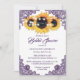 Convites de chá de panela de girassol roxos e personalizados com flores de girassol, luzes de cordas e rendas florais. Itens correspondentes disponíveis para complementar esses convites de chá de panela quic roxos elegantes.