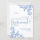 © Socialite Design Inc. Lindos giros de canto e floresce o cartão "serás minha dama de honra", pintado com cor azul-real suave, que complementa a coleção de casamento correspondente. Uma carta elegante para qualquer celebração do ano. Se você precisar de ajuda para personalizar ou quiser outros produtos criados com este design, por favor, não hesite em entrar em contato com Designs socialitas.