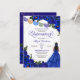 O convite da Quinceanera em rosas azuis reais com sotaques de ouro e uma garota com vestido elegante. Verifique o compro deste convite com meninas com diferentes cores de cabelo e tons de pele.