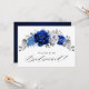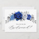 Elegante tema azul-real de prata branca você será meu cartão de proposta da dama de honra com buquê elegante de azul-real, Marinho, prata, cor branca pura, botões de flores de rosa e folhas verdes de eucalipto. Entre em contato comigo para obter ajuda sobre a personalização ou se você precisar de outro produto com este design.