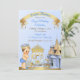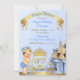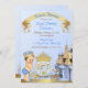 Bonito príncipe com coroa e carruagem em frente ao seu castelo. Feito em azul e ouro. Use para aniversários, chás de fraldas ou anúncios.