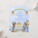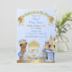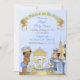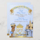 Bonito príncipe com coroa e carruagem em frente ao seu castelo. Feito em azul e ouro. Use para aniversários, chás de fraldas ou anúncios.
