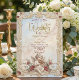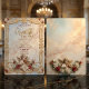 Transporte seus convidados para um reino de romance clássico com este design opulento, apresentando motivos celestiais e detalhes ornamentados para uma ocasião verdadeiramente grandiosa. Este design apresenta uma ilustração de óleo pintada digitalmente de um querubim tocando violino, colocada contra um fundo celestial de nuvens azul suave e raios de sol. A arte central é cercada por uma borda complexa que simula a aparência de pedra talhada e trabalho de acanto dourado. Buquês de tulipas e rosas vermelhas e brancas empoeiradas acentuam os cantos, criando um contraste rico contra a paleta de creme e azul pastel. Esta é uma imagem impressa plana com um efeito de relevo em ouro falso e textura de pedra, não sendo uma folha metálica, metal ou material talhado real.