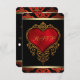 RSVP vermelho, preto e dourado com rico coração vermelho de cebola e fundo vermelho preto e ouro damasco. Esse RSVP de casamento elegante vermelho, preto e dourado é facilmente personalizado com seus detalhes de evento.