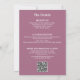 Apresentando fontes na moda elegantes e um layout tradicional em um fundo mauve, este é um convite bonito para o casamento com uma reviravolta moderna - o verso inclui um código QR que facilita a digitalização por um convidado usando seu telefone para visitar seu site de casamento. O convite tem espaço no verso para informações como detalhes de recepção, detalhes de alojamento e também uma nota convidando o convidado a visitar seu site para obter ainda mais informações ou responder on-line. Todos os textos são fáceis de personalizar usando o modelo de personalização on-line antes de fazer pedidos. Depois de personalizar todo o texto, se precisar fazer ajustes avançados, como ajustar o layout, role para baixo até o botão "Editar usando a ferramenta Design" para "personalizar ainda mais".