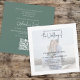 Esta design apresenta uma imagem minimalista moderna e verde, elegante fundo de sábio verde botânico com texto de caligrafia, para cobertura branca de casal de noivado, simplista tradicional e simples, com ampersas monográficas e fundos, fonte de tipografia de caligrafia romântica, estilo vellum da cobertura chic, romântico da elegância rustica moderna, uma simples cobertura de texto de fotografia, fotos de casamento modelo com código QR digitalizável para que o seu convidado possa visitar facilmente o seu site de casamento e o rsvp online. com detalhes do casamento, mais informações