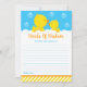 Esta frase bonita e divertida do cartão de sabedoria apresenta um adorável pato amarelo e patinando em bolhas brancas de banho de sabão sobre um fundo azul brilhante com fita laranja e listras amarelas. O texto combina o script manuscrito e as fontes sans serif para uma aparência na moda e moderna. Isto é perfeito para um Chá de fraldas.