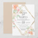 COMPROMISSO DE CASAMENTO CONVITE | Flores em aquarela em tons pastéis de coral, rosa beijado, amarelo, creme e delicadas folhas verdes em cascata ao redor de uma moldura geométrica dourada multifacetada em estilo diamante. O verso é uma cor coordenada complementar. Personalize o texto, o estilo da fonte, a cor e o tamanho. Criamos este modelo para facilitar a personalização com suas próprias informações. Esta é parte de uma Suíte de Papelaria de Casamento completa com papelaria de casamento, chá de bebê e outros eventos projetados por WhimsicalArtwork™.